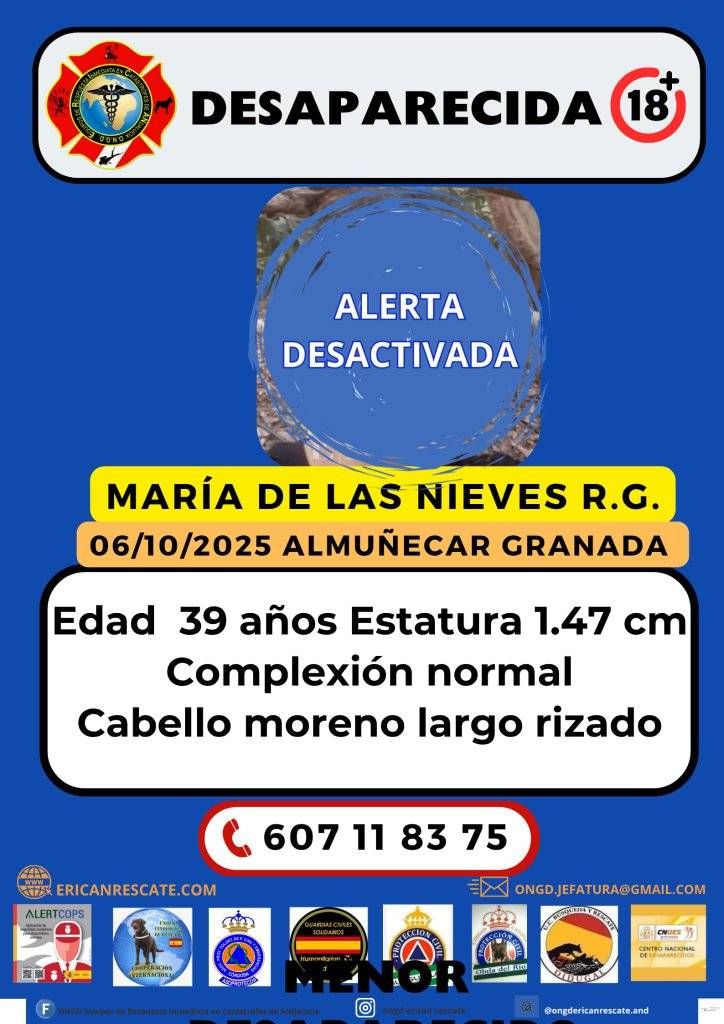 ÚLTIMA HORA: La ONGD Equipos de Respuesta Inmediata en Catástrofes de Andalucía ha comunicado que ha sido localizada, por lo que se ha procedido a desactivar la alerta.