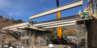 La colocación de enormes vigas para la reconstrucción del puente de...